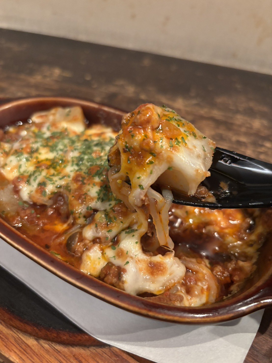 昭和村産のこんにゃくを自家製ミートソースで煮込みラザニア風に! たっぷりチーズをのせて、こんがりと焼きました。