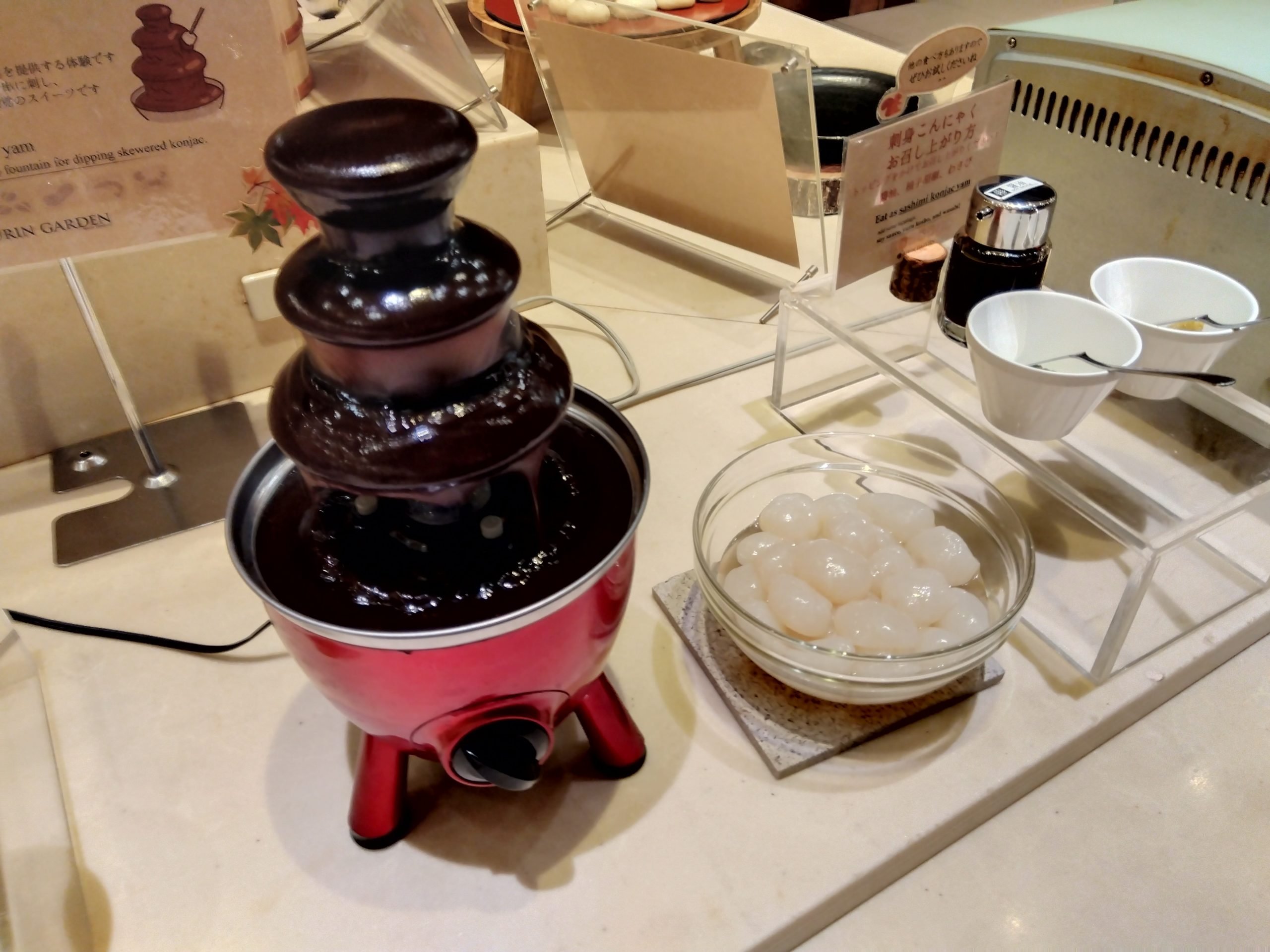 チョコレートフォンデュかと思いきや、群馬名物の「こんにゃく」をつかった「こんにゃくファウンテン!」 沼田産のちゅるちゅる玉こんにゃくを、群馬の甘味噌を絡めて召し上がれ。 ビュッフェの日替わりメニューの一つですので、ご宿泊日や利用日のメニューとして出ていたらラッキー♪